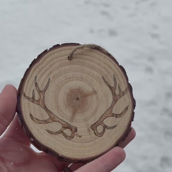 Hand-burned elk antler ornament with paired antlers. Measures 3.5"-4". Handcrafted pyrography detailing on real wood round. Perfect to hang on your tree!
