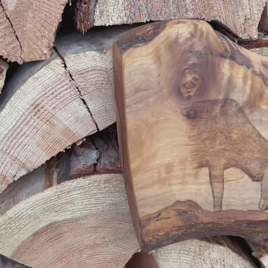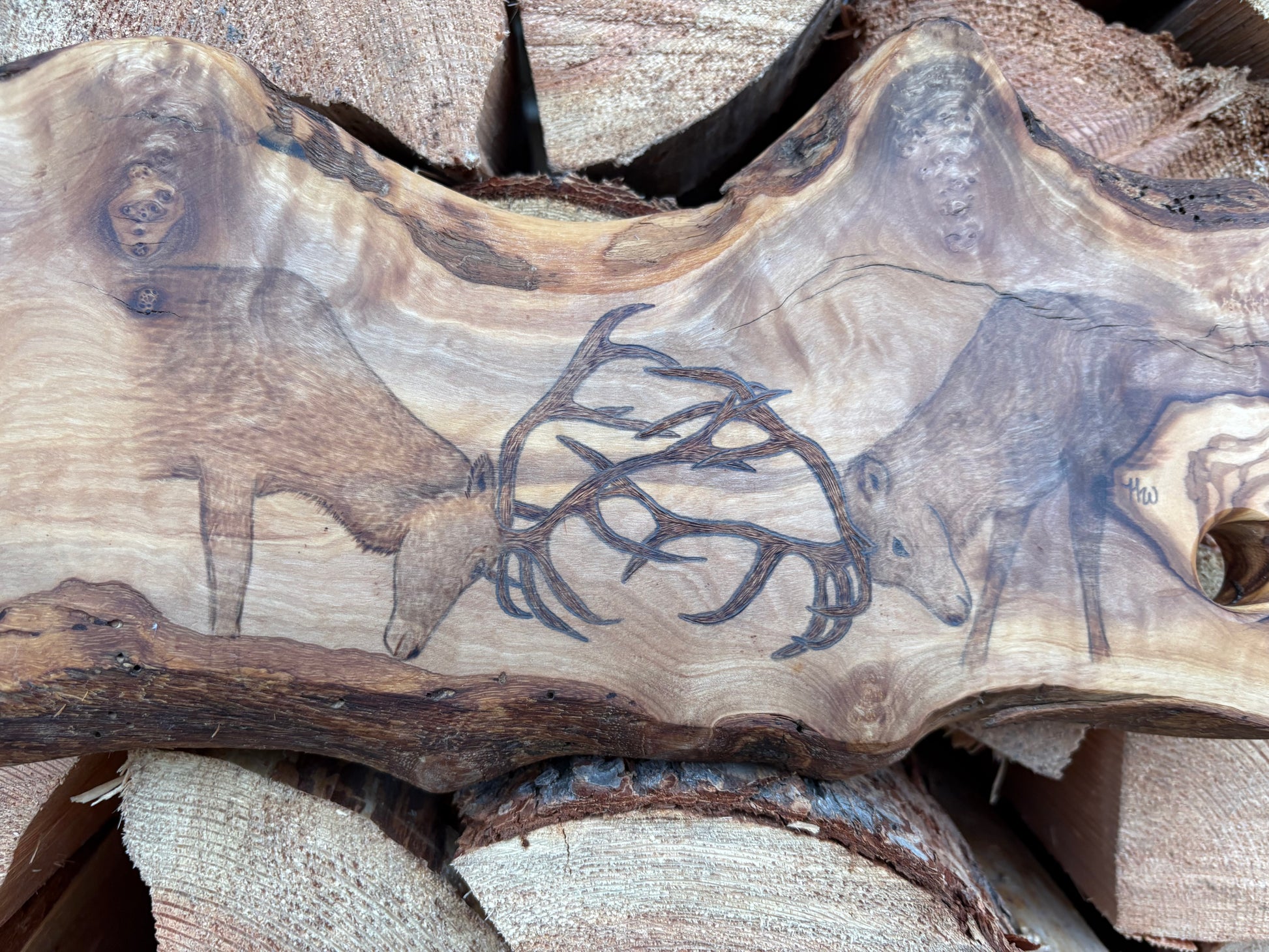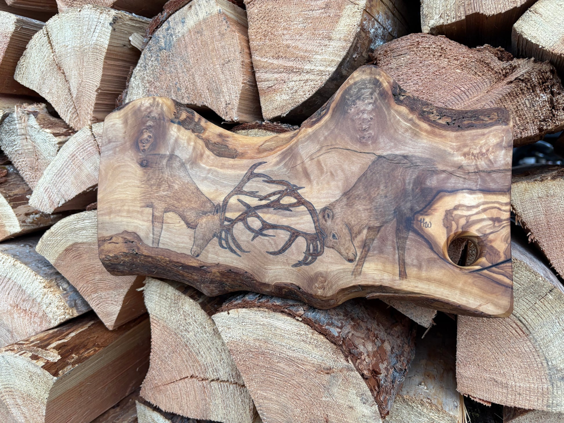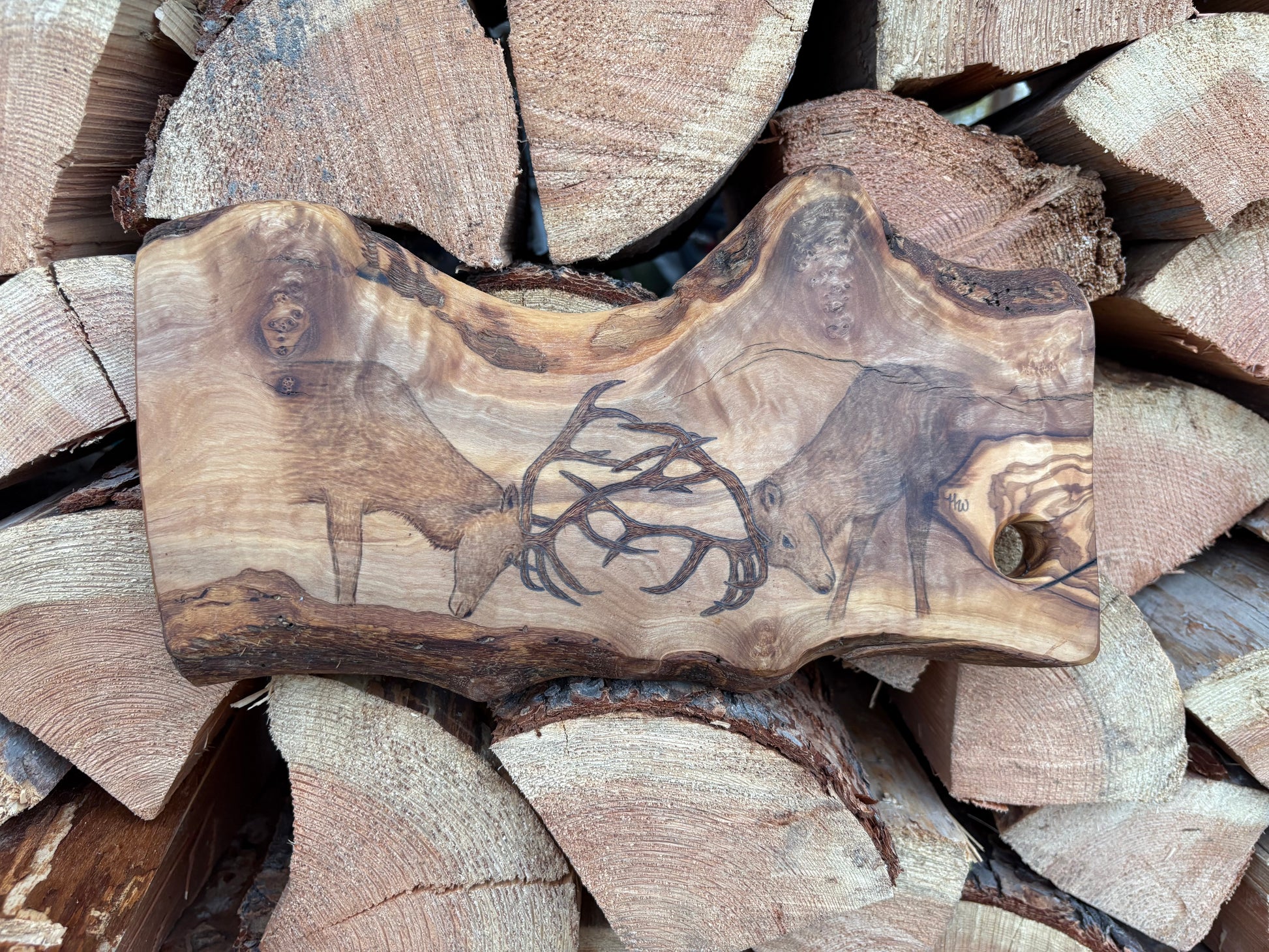 The Elk Charcuterie Board, crafted from durable olive wood, features a striking design of two fighting bull elk. At 12.5"x6.5", it is the perfect size for serving delicious meats, cheeses, and fruits. Elevate your next gathering with this unique and functional piece.