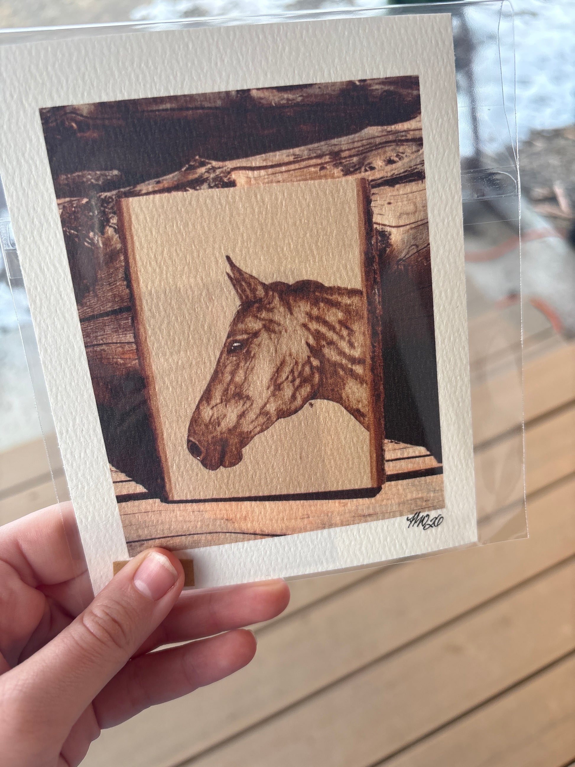 This is a high quality print of a wood burned horse portrait that was wood burned by me. Measures 5"x6" and comes in a protective plastic sleeve.