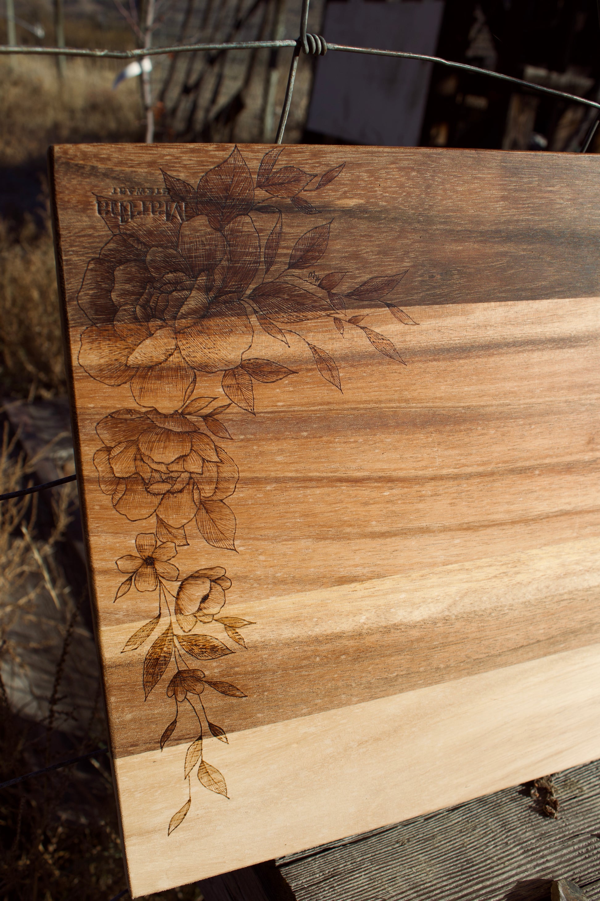 Brighten up your kitchen with this large, one-of-a-kind cutting board! Measuring 12.5" x 18", it’s hand-decorated with charming wood-burned floral borders that bring a touch of nature’s whimsy to your prep work. Durable and delightful, this board makes chopping veggies a little more fun and your countertop a lot more stylish!