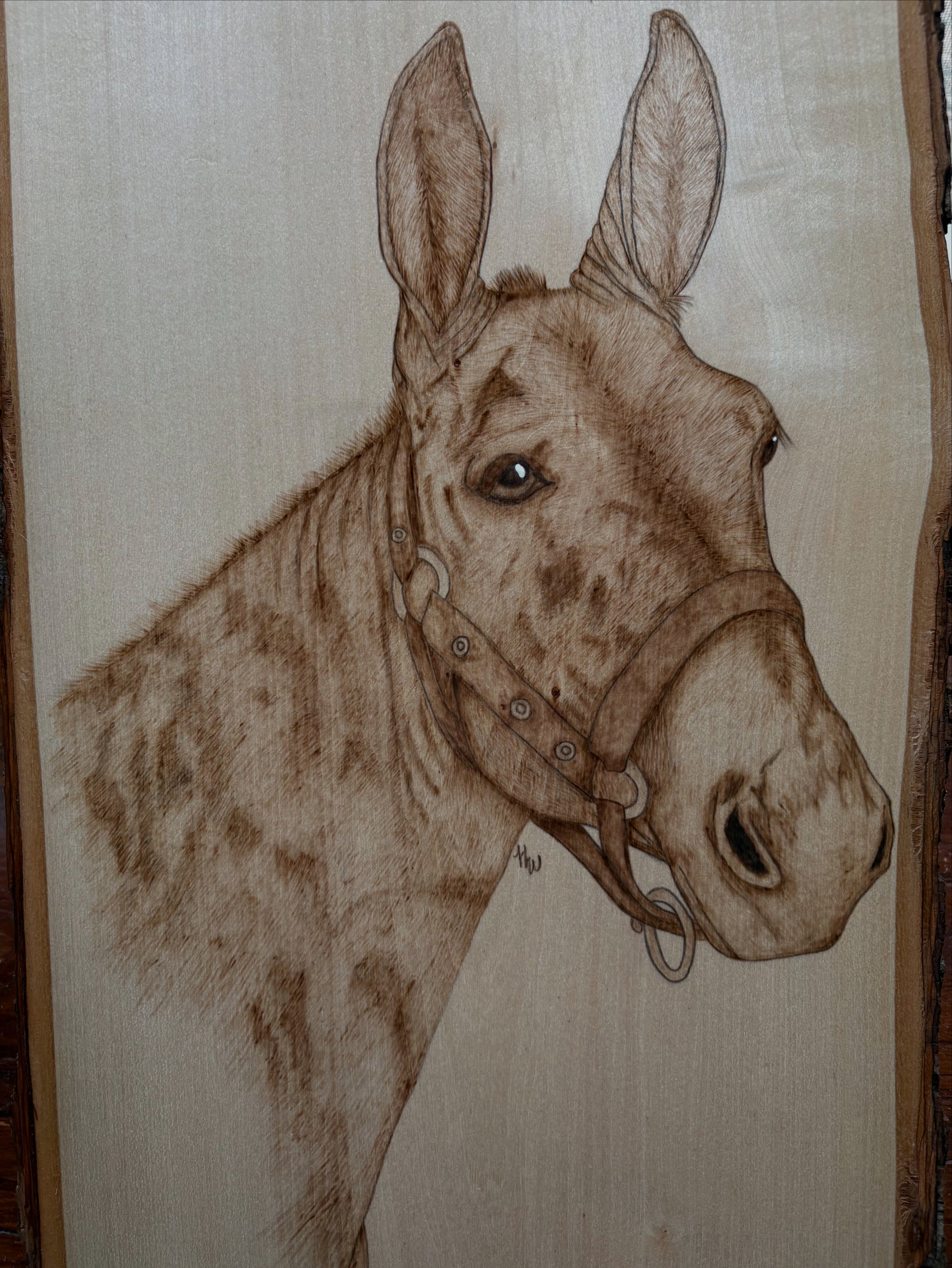 This Mule Pyrography Piece is hand-crafted on a sturdy basswood plank, measuring at 11"x16". Each piece is uniquely created by me, using the art of pyrography to create a one-of-a-kind mule design. Add a touch of rustic charm to your home decor with this playful and creative piece.