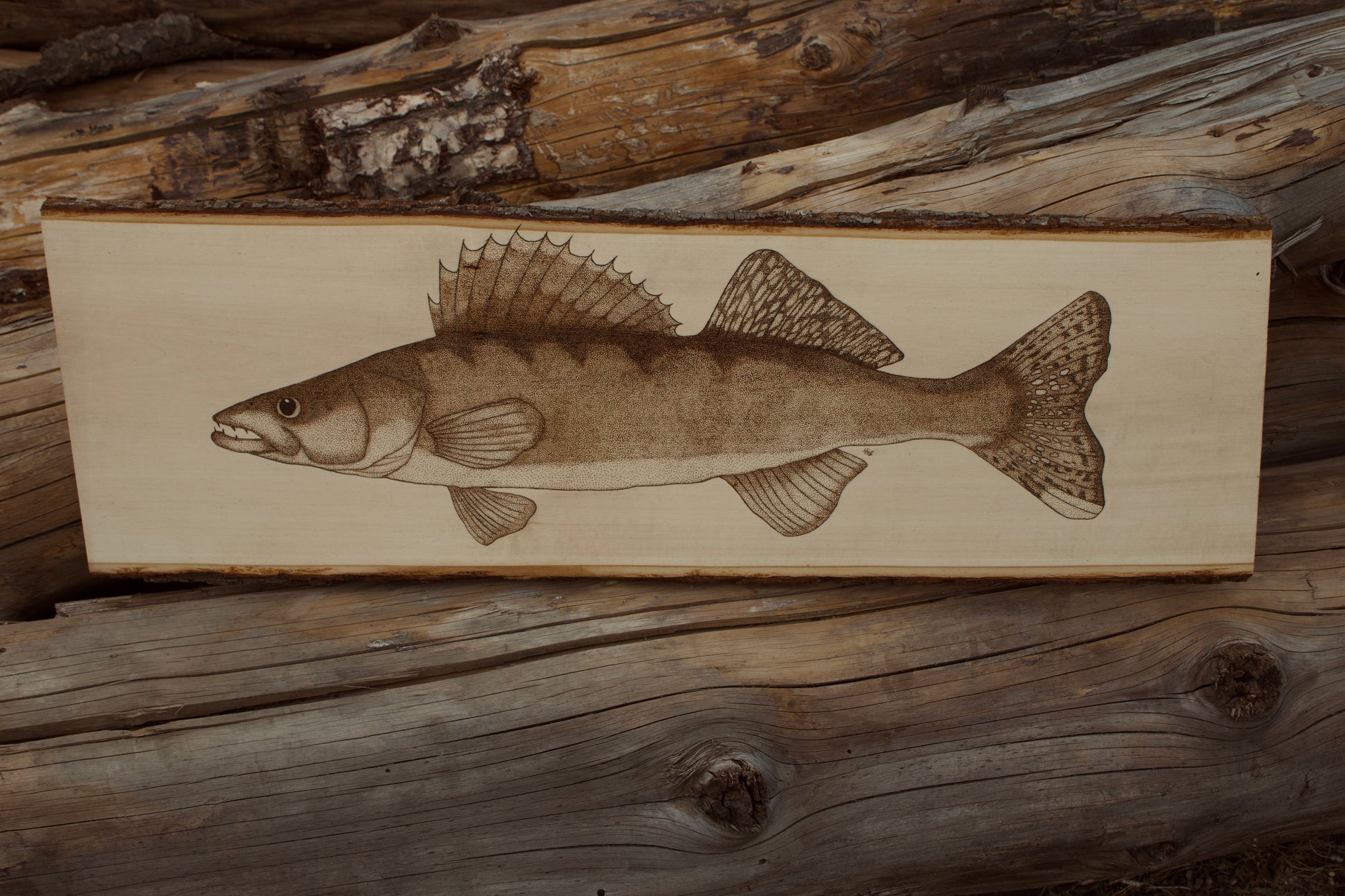 This is a beautiful hand burned walleye on a 3ftx1ft live edge basswood slab.